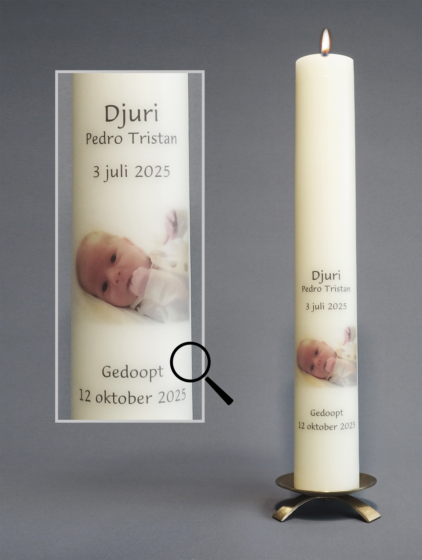 Een doopkaars met de foto van de kleine? Dat kan. De moeder van Djuri heeft de indeling aan ons opgegeven en de foto naar ons gemaild. Wij hebben dat op de kaars gedrukt en daarna de kaars nog eenmaal over gedompeld in onze wax-ketel. Het drukwerk zit dus IN de kaars en kan niet meer beschadigen. Dit is rechte dompelkaars met bijenwas, 40 x 6 cm.